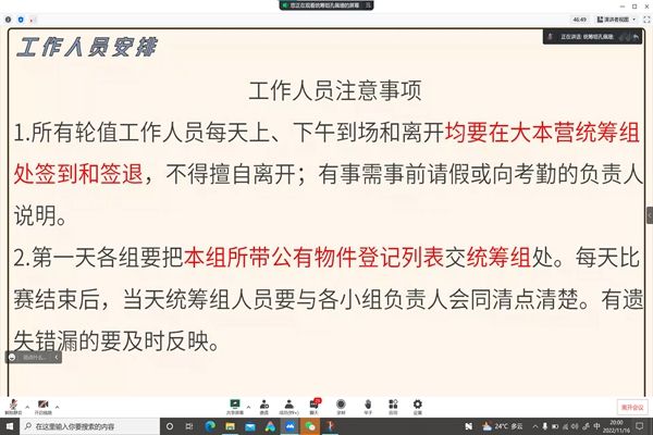 会上,孔佩珊从各机构工作安排、各组分工情况、工作人员注意事项及体育道德风尚奖四个方面出发,为参会人员介绍了此次校运会的工作安排。此外,她还详细说明了各组工作任务,本次校运会的工作组织按内容划分为统筹组、纪检组、宣传组、通讯组、后勤组及医疗组,并且每个小组明确了组长与组员的职责。她强调,校运会第一天,工作人员要提前到达现场,做好准备工作,确保开幕式顺利进行。