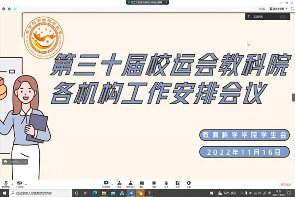为扎实推进校运会各项工作井然有序地开展,11月16日晚,教科院利用腾讯会议的线上形式举办第三十届校运会工作安排会议。教科院辅导员朱丽儒和学生机构干部代表一同出席本次会议。会议由孔佩珊主持。