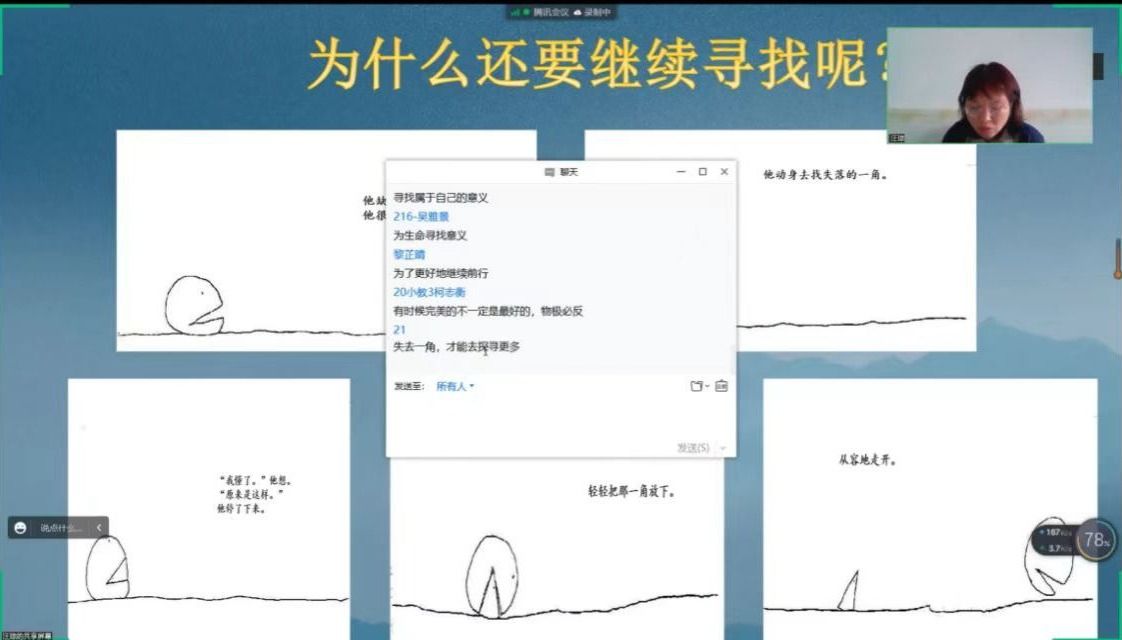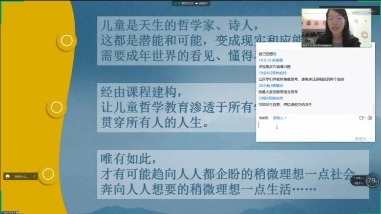 会末,韩芳芳老师对会议实况、讲座内容、评论区留言等方面进行了总结。她指出儿童哲学的探究道路任重而道远,爱思考是大多数人可为的,爱思考并有持续的热情是难得的,若把它放在研究的到路上,再结合教育实践是十分可贵的,是梦想家对理想的追求。哲学因为儿童的参与开拓了更为自由的诠释空间,而儿童的本真天性,为哲学带来了独特的审美价值,直面现实的丰富,回归本源的思考随时都有可能发生。所以,讨论儿童哲学,我们应该关注的不是哲学抽象概念的考查,而是哲学在哪里发生,在哪里生长,在哪里给我们带来破解生命难题的勇气。本次专题讲座让静态的哲学发生了动态的变化,给既往后来着留下了一条生动的探索路径。她对汪老师的用心讲解、同学们的热烈互动与积极表示衷心感谢!