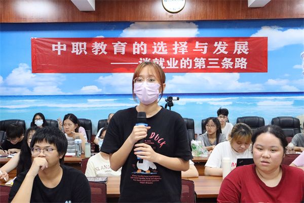 陈凯莉就中职教育简介、中职教育教师的发展、学前教育学生就业选择三个板块进行详细讲解。陈凯莉介绍目前中职教育的基本情况,重点围绕中职教育教师的发展提出以下几点建议:一是广参赛,勤锻炼,提升自身综合素养。二是重内涵建设,通过观摩精品课,加入名师优秀队伍等引领促进自身发展。三是重职称评定;关注职称评定的要求,做好日常教学工作为评选做准备。 四是立足课堂教研;从课堂问题确立课题,细心研究,提升科研能力。关于职业目标定位, 她谈到,职业定位决定未来发展的前景,作为大学生应学会思考自己的职位定位,提前做好规划。