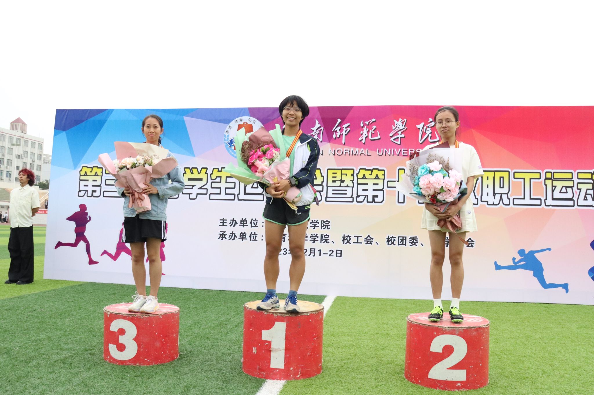 12 月 1 日,随着一声枪响,赛道上的健儿们如离弦之箭般,展开了激烈的角逐。在观众们热烈的掌声和欢呼下,最终 22 级小教 1 班龙飘婷以 1 分11 秒 94 的成绩夺得女子 400 米冠军,以 2 分 52 秒 96 的成绩夺得女子 800米的第五名,给教科院带来了喜讯。