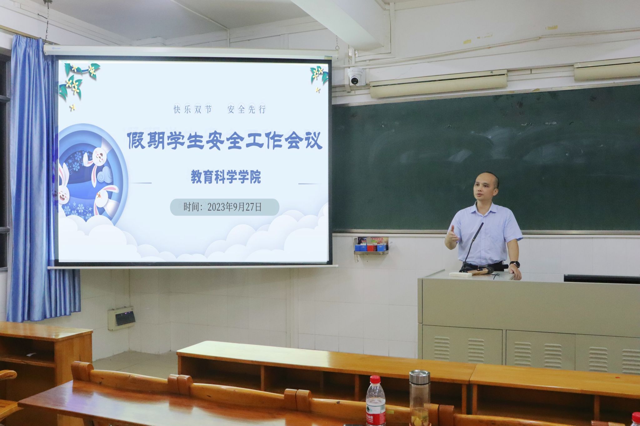 9月27日晚,教育科学学院于第四教学楼C栋806室召开中秋国庆假期安全主题教育会议。教科院党委副书记陈理才、辅导员苏贵老师、李水清老师、朱丽儒老师、黄谭腾老师、康安琪老师以及学生会工作人员、各班学生代表共同出席本次会议。此次会议,意在落实学校《关于做好2023年中秋节、国庆节放假安排的通知》,增强学生的安全意识。
