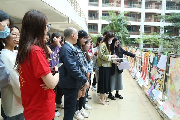在比赛现场,参赛选手们全身心投入到绘画之中,他们巧妙地将各种中国传统文化元素如纸鸢、戏曲、瓷器、舞狮等等融入到作品里。时间一分一秒过去,画纸由一片空白逐渐变得色彩斑斓。美丽的画作和选手们忙碌的身影吸引了教科院党委副书记陈理才前来观赛。在画作展示时,他观赏起每一幅作品,与选手们一起讨论画作的内容和主旨。
