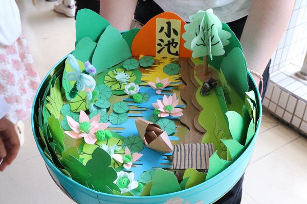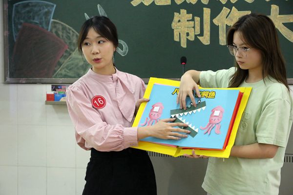 在长达两个小时的设计与制作环节中,各位选手纷纷发挥自己独有的创意和智慧,利用快递箱、矿泉水瓶等废弃物品,通过绘制、上色、剪贴、拼接等手法,与团队内的成员进行默契的分工与合作,不紧不慢地完成每一个步骤。在团队的共同努力下,一件件精致美观的教具和学具最终成形,选手们依次向评委和观众展示与解说作品。