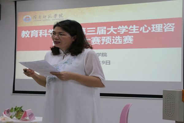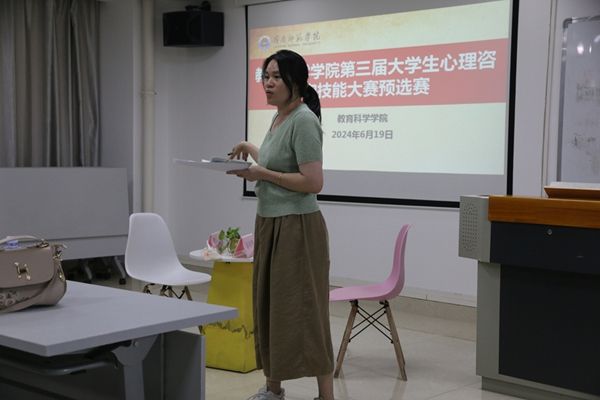 教育科学学院于6月19日下午在教四E-303举办第三届大学生心理咨询技能大赛。教科院心理系陈秀芹主任、岭南师范学院附属中学潘少霞老师、湛江财贸学校赵晓庆老师出席本次比赛并担任评委。