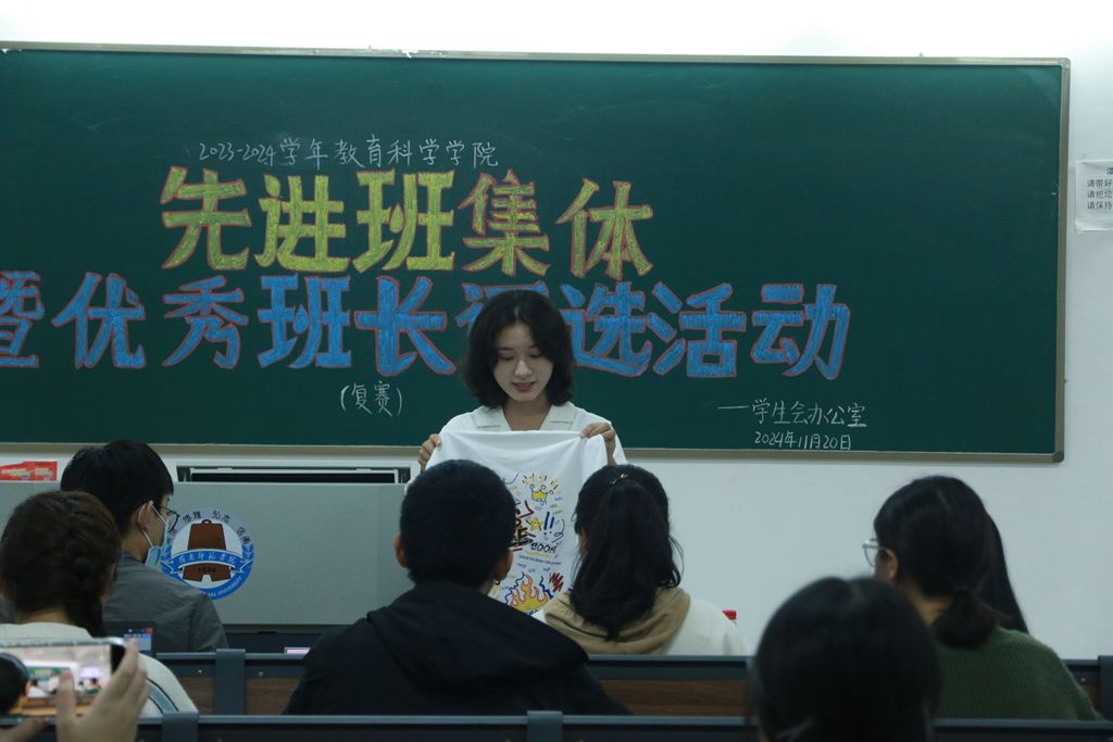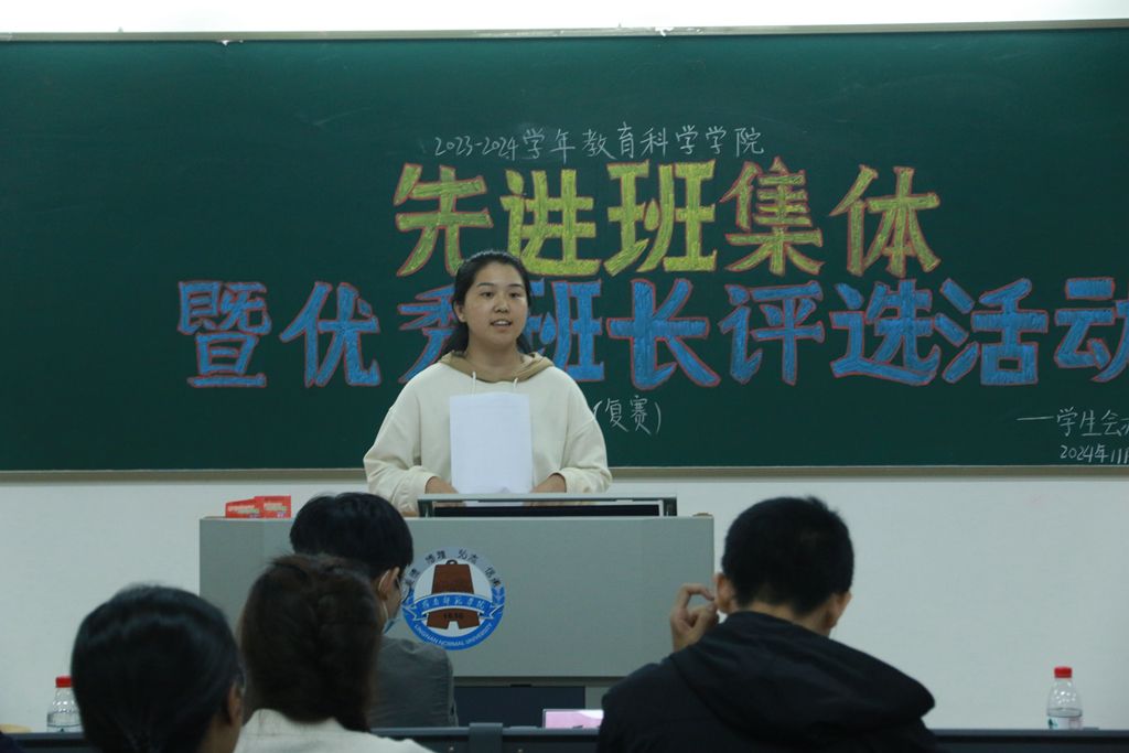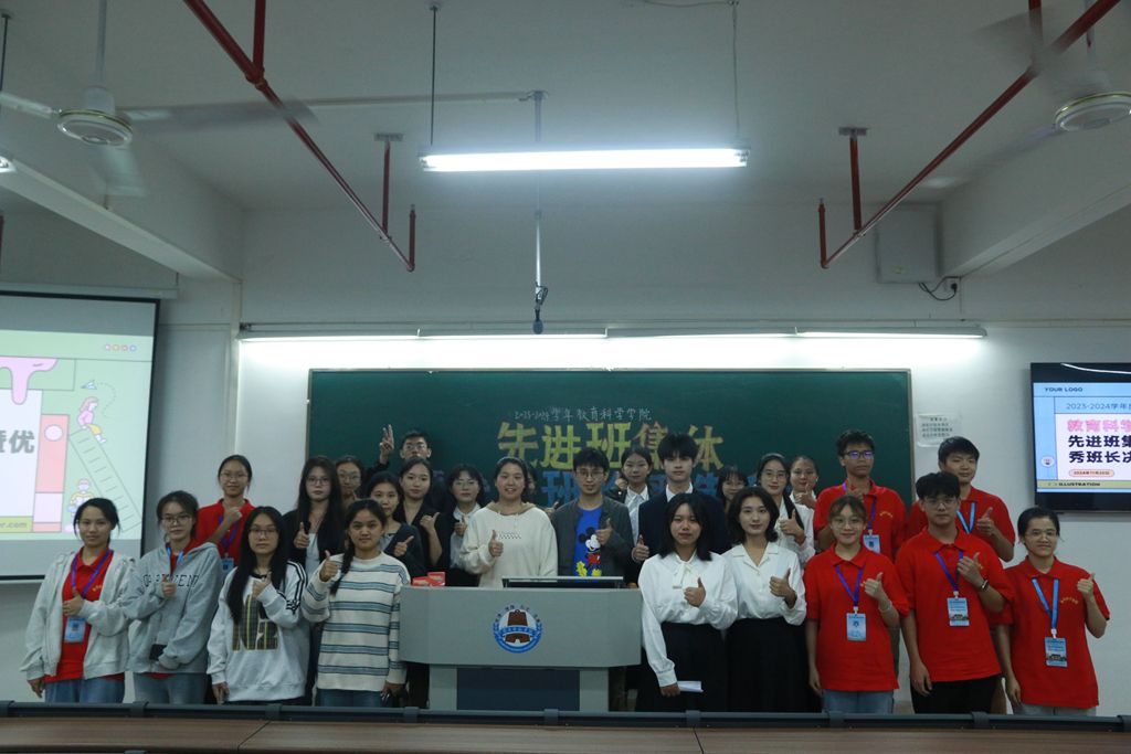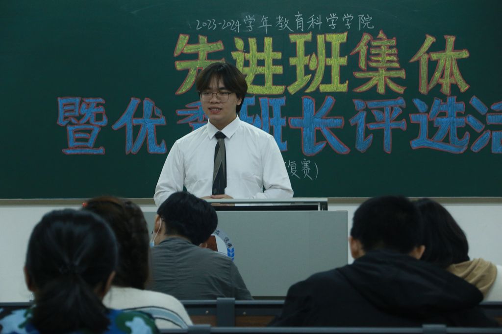 近日,教科院于第五教学楼A-211教室举行2023-2024学年先进班集体暨优秀班长评选活动。教科院辅导员康安琪老师、王春晖老师和学院八大学生机构代表一同出席了本次活动。