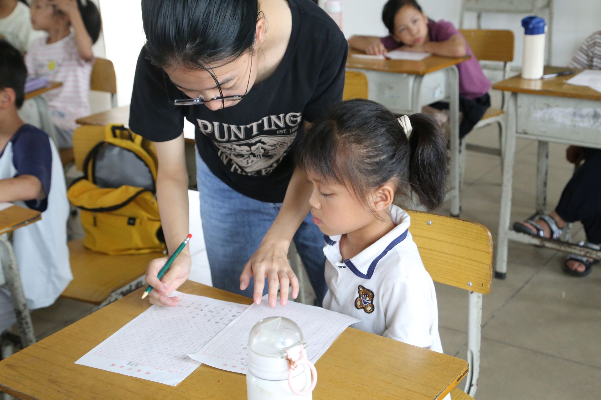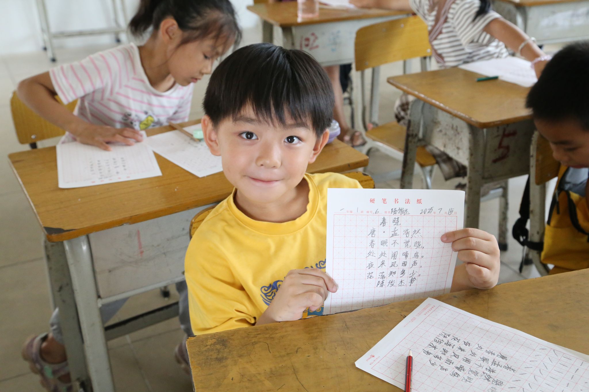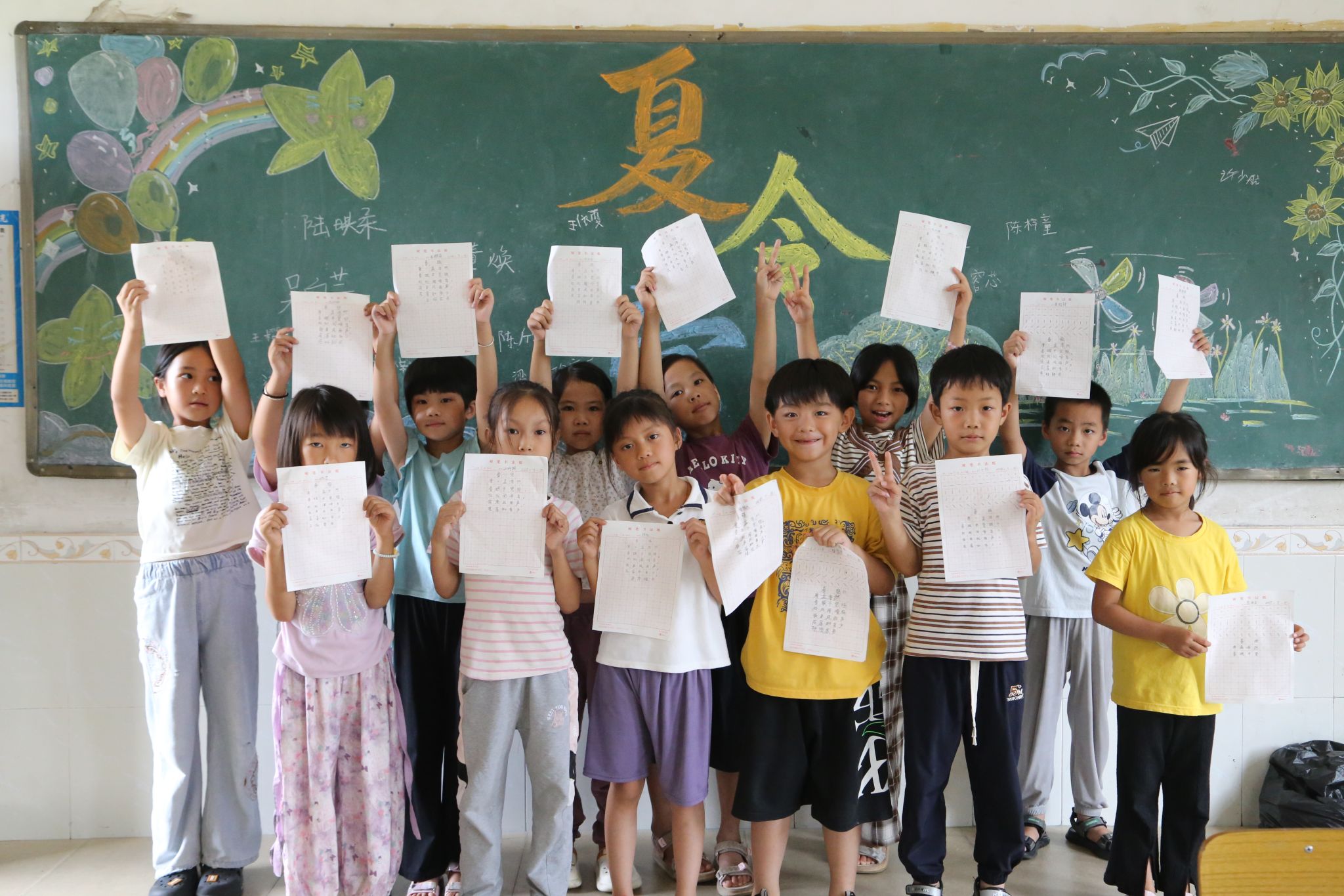 “破浪”突击队始终秉持“寓教于乐”的理念。罗方彤在教学中融入儿歌、肢体动作和小组竞赛,让课堂充满活力。课后,孩子们兴奋地展示自己的作品,工整的笔画间流露出对书法的热爱。