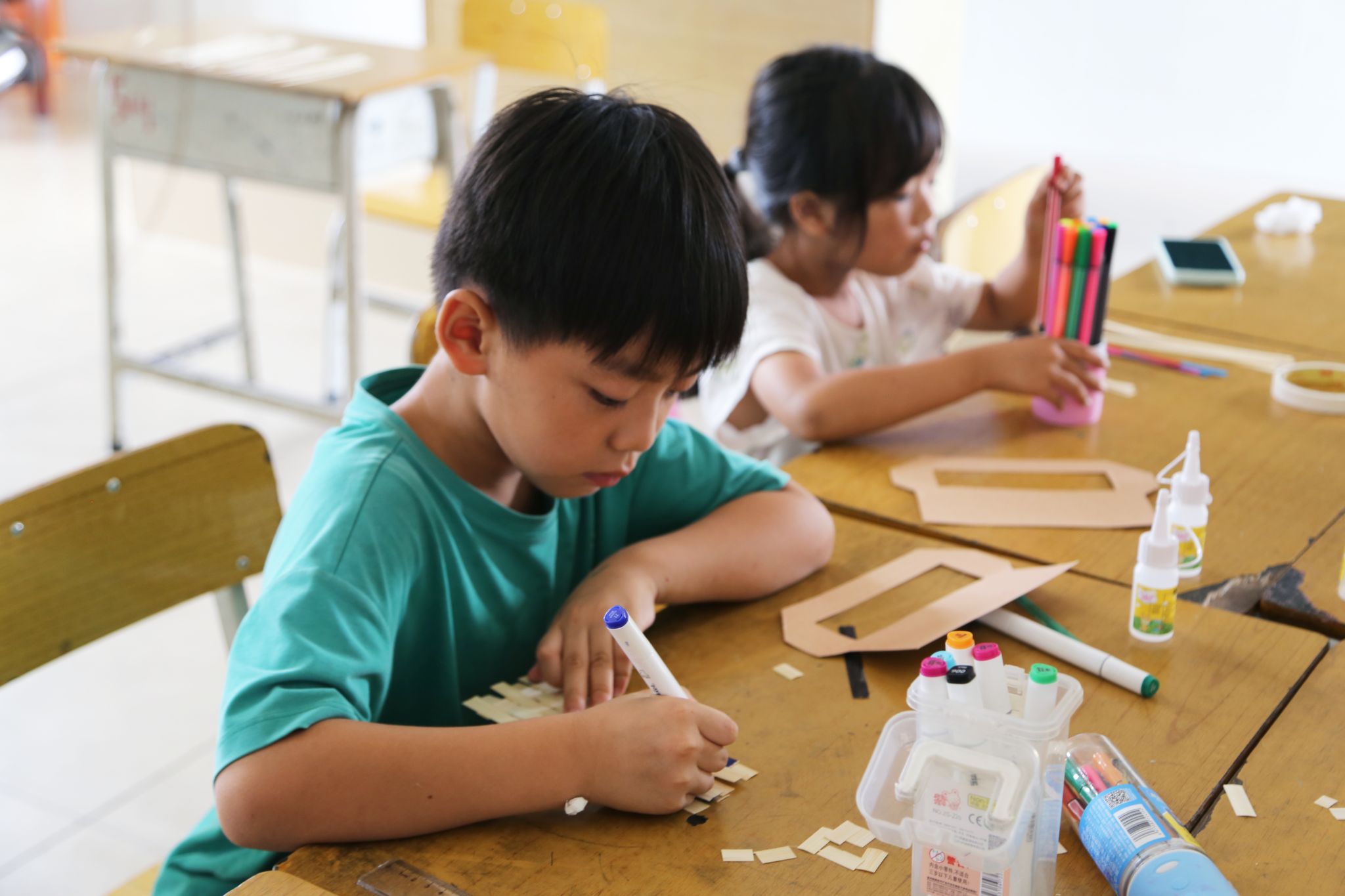 在手工课堂上,队员刘叶儿和队员何荞珊摇动着精美的竹编扇子,孩子们的眼中闪烁着好奇与兴奋。在这堂竹编手工课上,队员刘叶儿和队员何荞珊不仅带孩子们领略了信宜竹编文化的博大精深,还教了“压一挑一”的编织方法。在队员刘叶儿和队员何荞珊悉心教导下,有的孩子全神贯注地编织着扇面和书签,每一根竹条的穿插都小心翼翼;有的孩子则拿起画笔,为书签和扇子增添独特的色彩;当书签与扇子的成品托于掌心时,汗湿的小脸上满是自豪--古老的“挑压”技法,此刻在孩子们手中焕发新生,每一个作品都承载着他们的汗水与梦想。