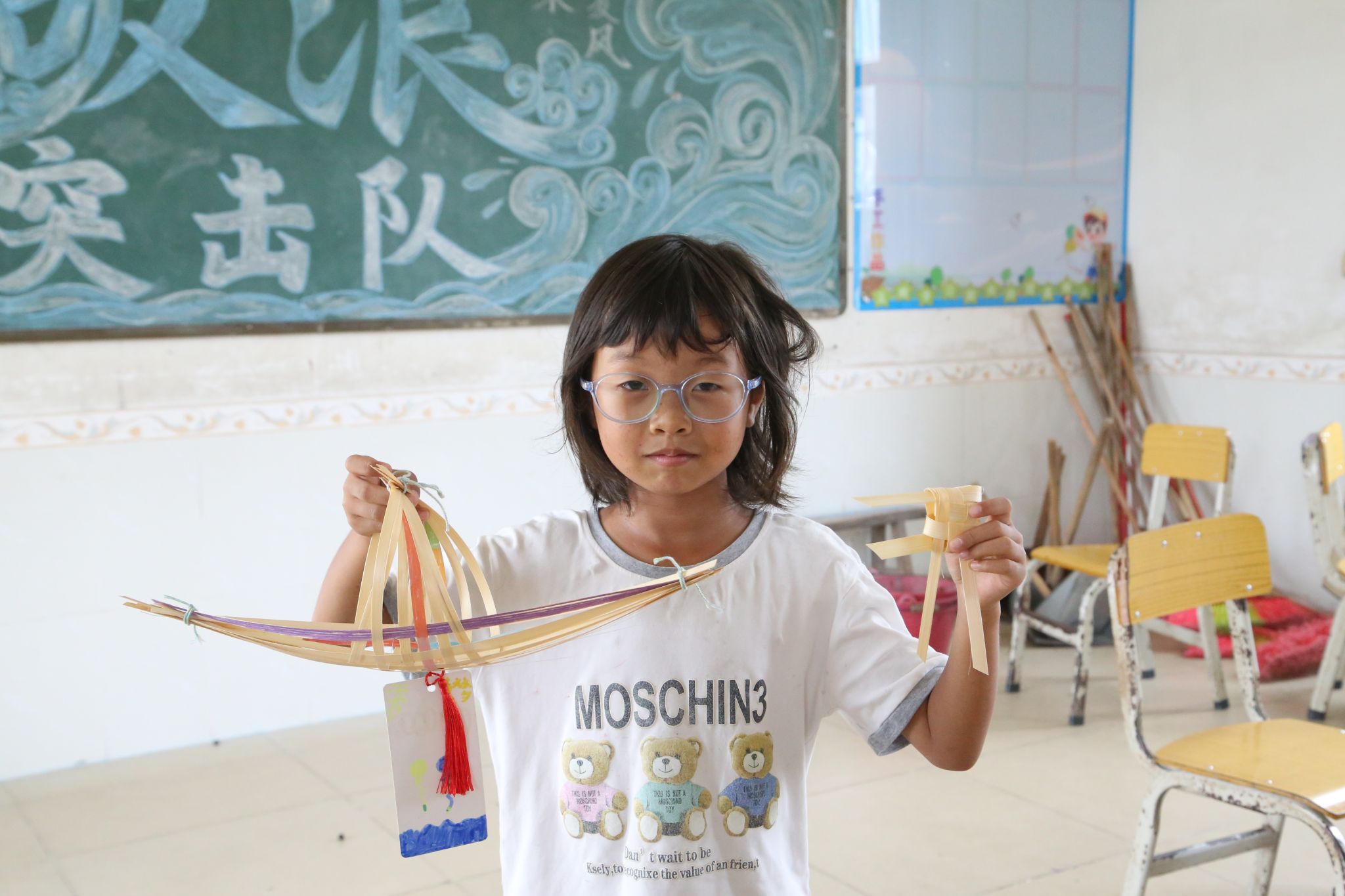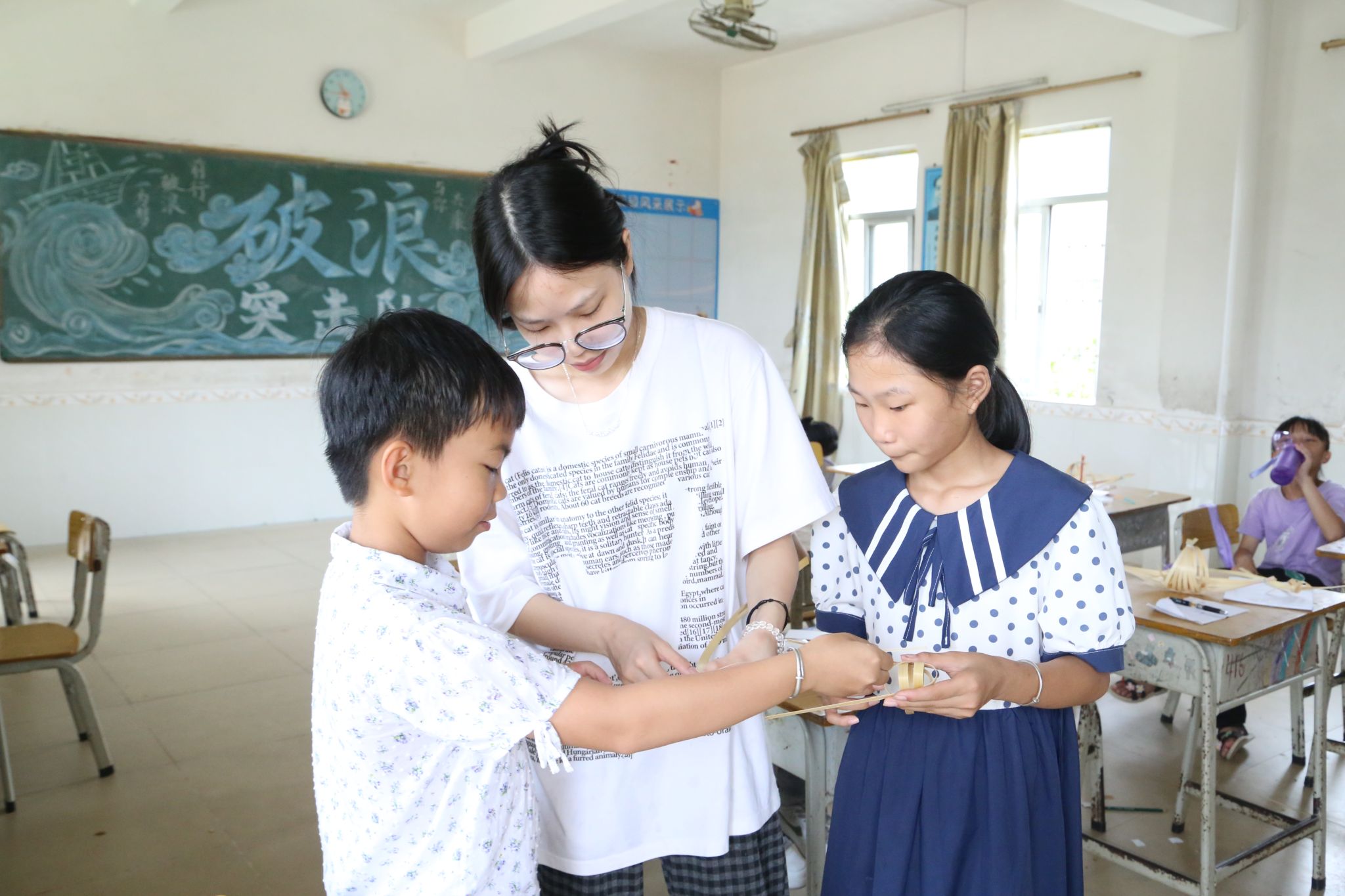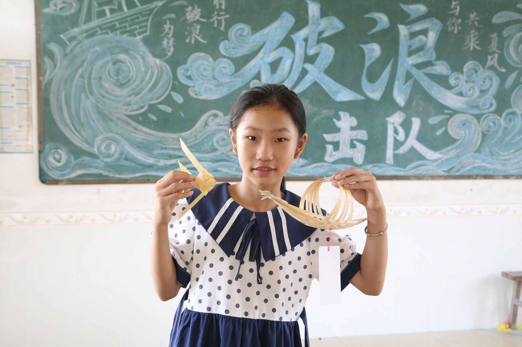 在这充满创意与乐趣的手工课上,教室里洋溢着欢声笑语。孩子们不仅学会了实用的竹编技艺,更在心中种下了传承非遗竹编传统文化的火种。一只小船、一把扇子、一枚书签、一串风铃,皆如燎原的星火,点燃了非遗竹编传统技艺传承的希望。当非遗竹编传统技艺与青春创意激情碰撞,“破浪”突击队正以青年之力,为乡村文化振兴注入汩汩活水。