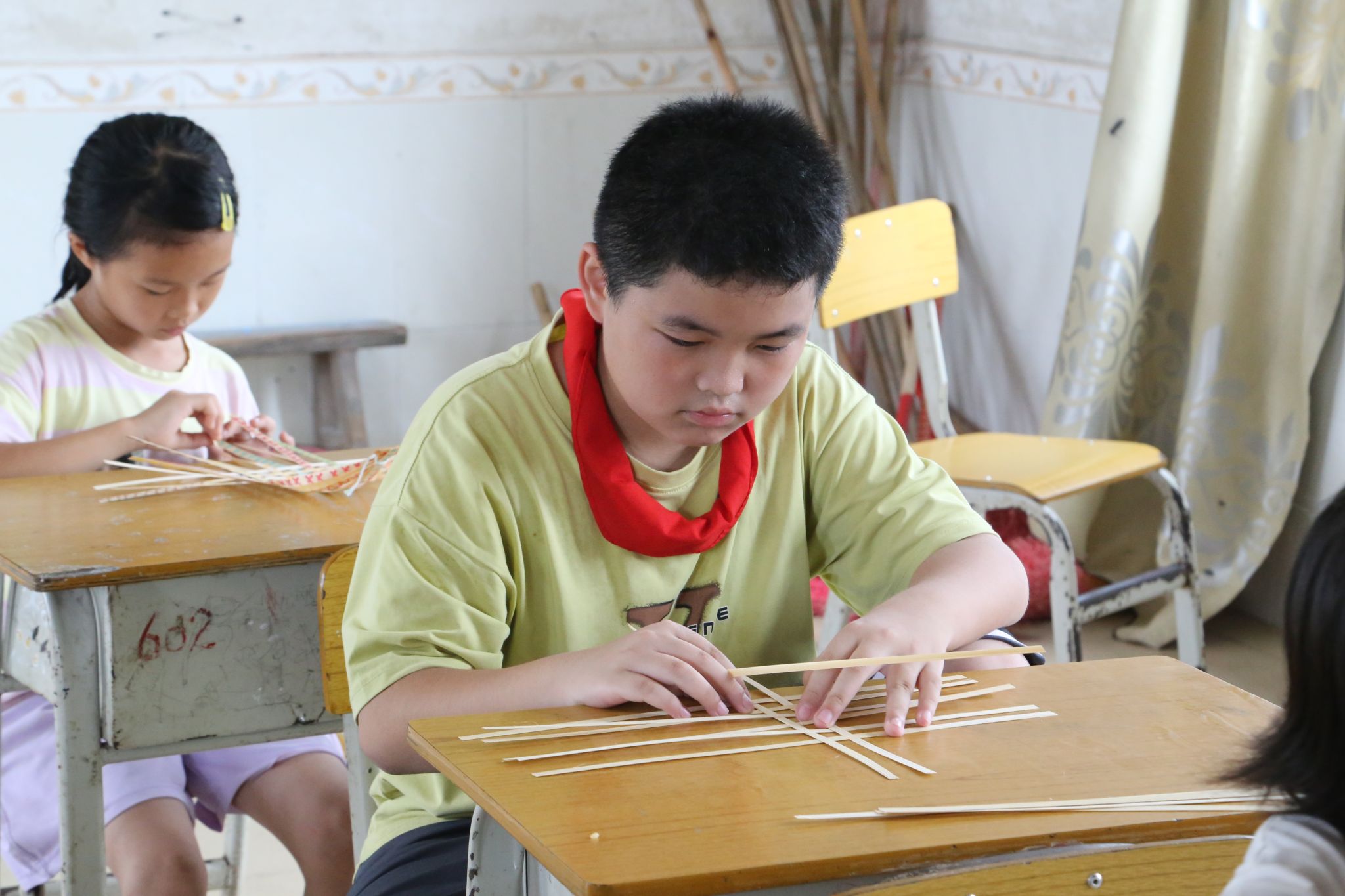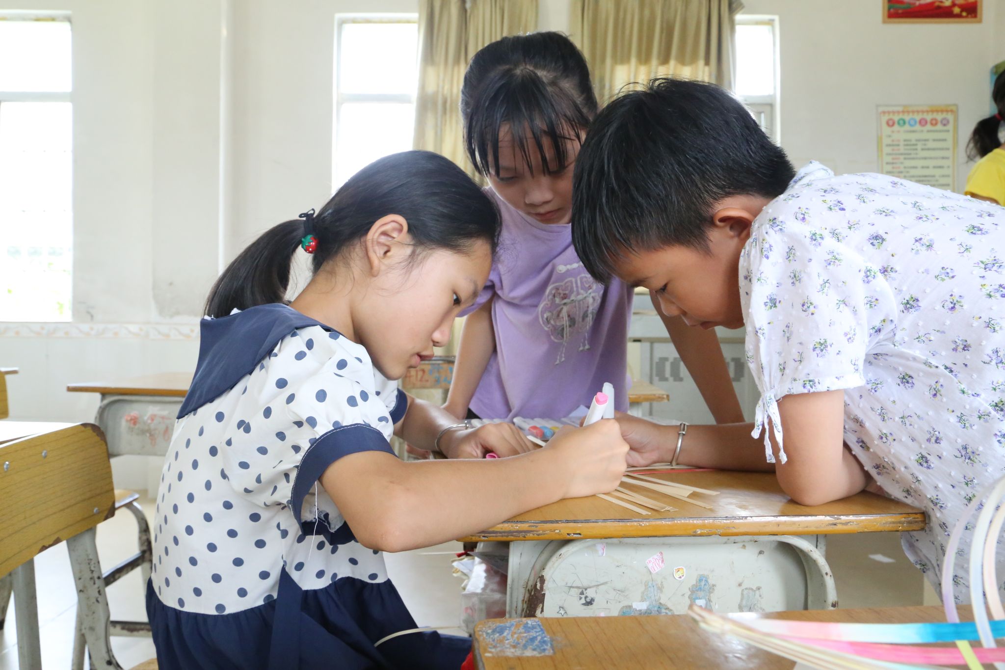 教室的一角,微风轻拂,传来清脆悦耳的叮咚声。那是孩子们自制的竹编风铃。在队员陆映柔的耐心教导下,孩子们化身为心灵手巧的小工匠,专注地编织着一个个精致的竹编风铃。孩子们亲手编织的作品,不仅装点了素朴的教室,更化作陪伴成长的“竹伙伴”,记录着欢声笑语的每一刻。