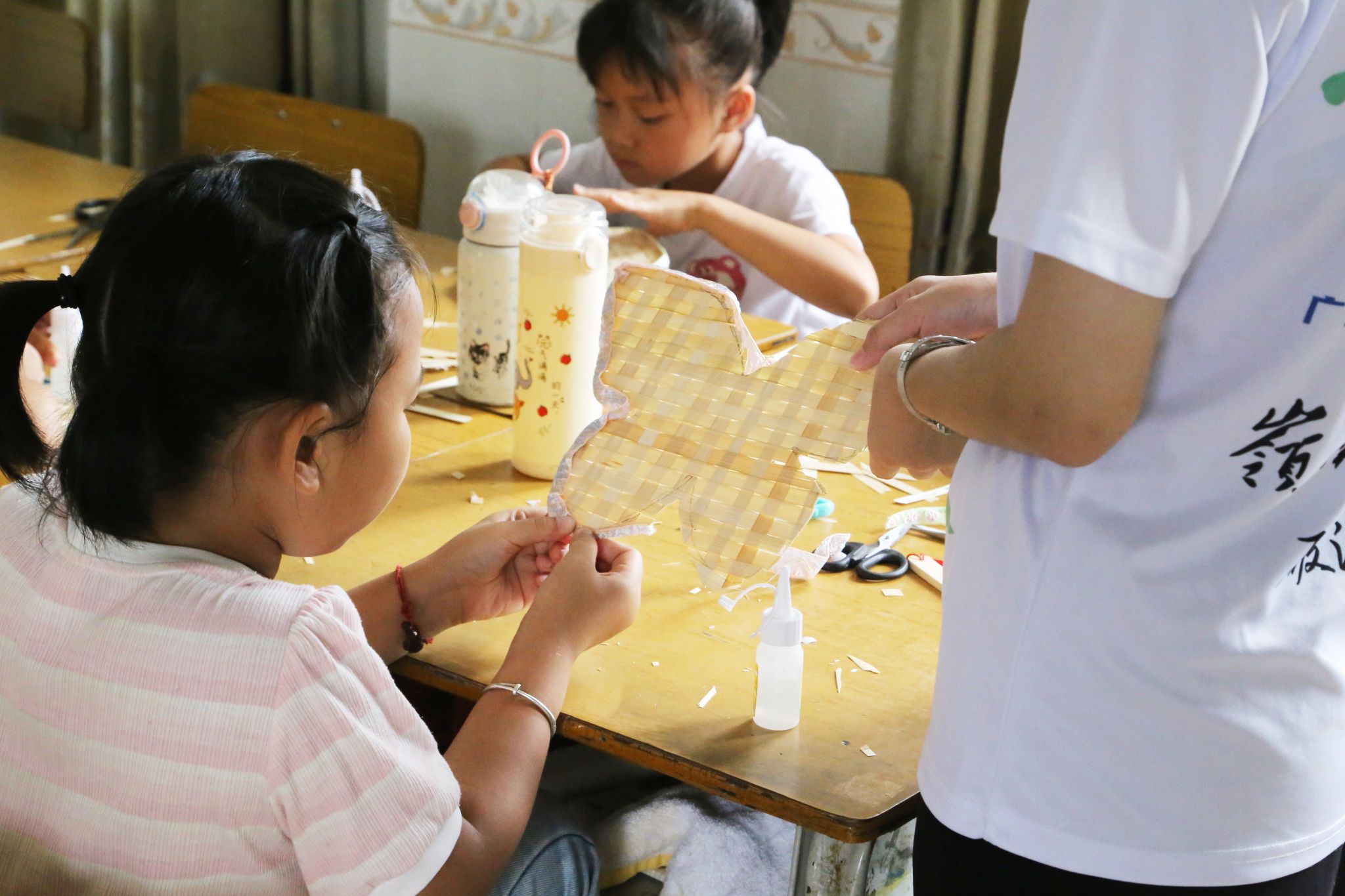 队员协助学生制作竹编挂饰(罗方彤摄)