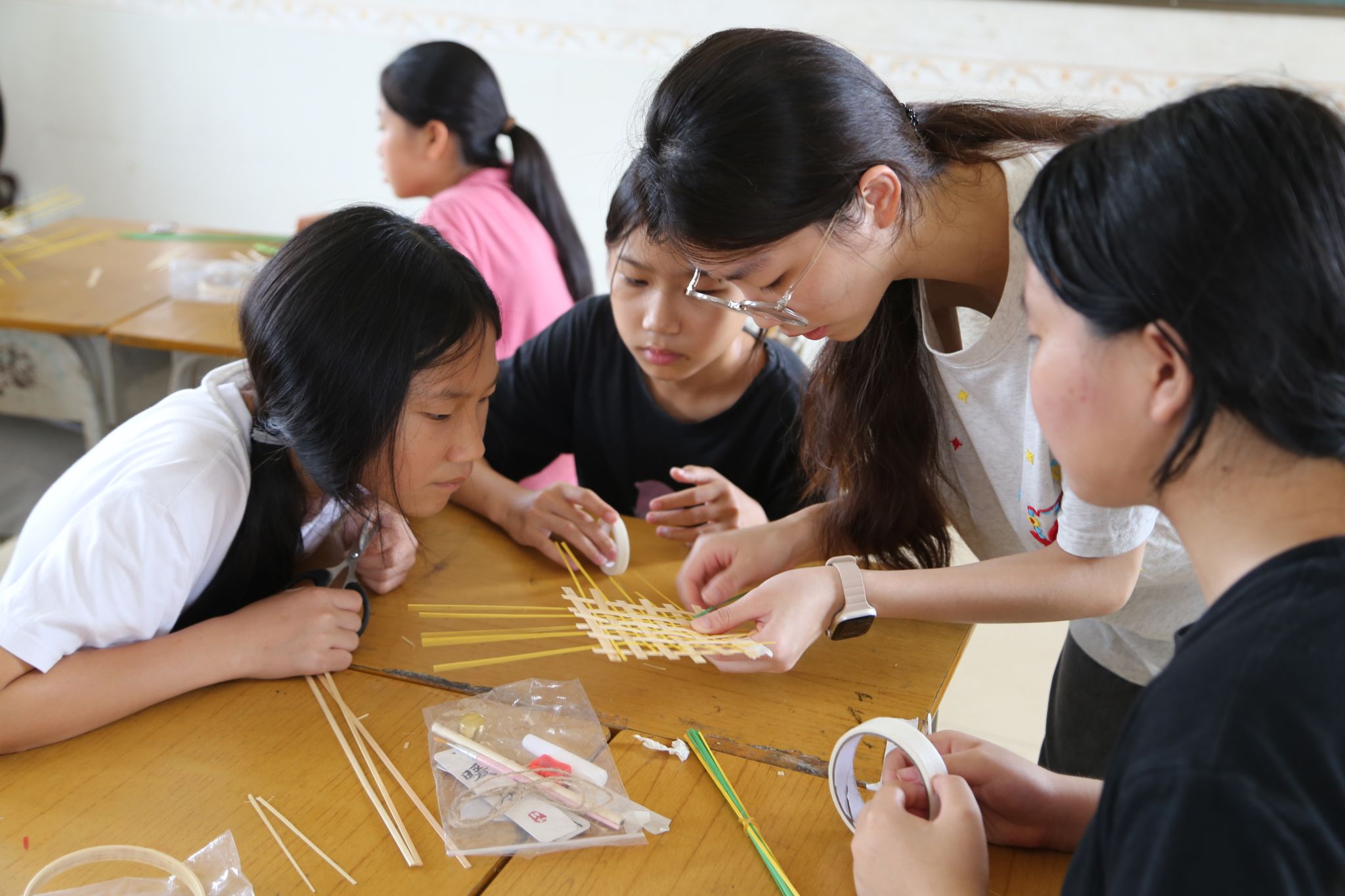 队员协助学生制作竹编手工品(欧董焕摄)