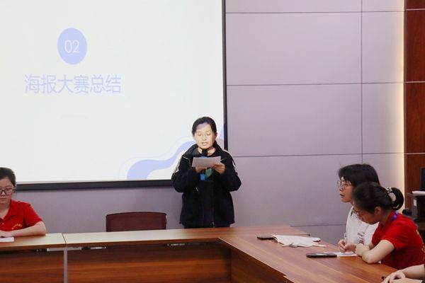 随后,海报大赛负责人植丽如就“铭记历史守和平,砥砺前行谋复兴”主题海报大赛进行总结:比赛组织工作整体开展顺利,但仍存在前期宣传力度不足、工作落实不到个人等问题,负责人表示后续将对这些问题进行针对性改进。
