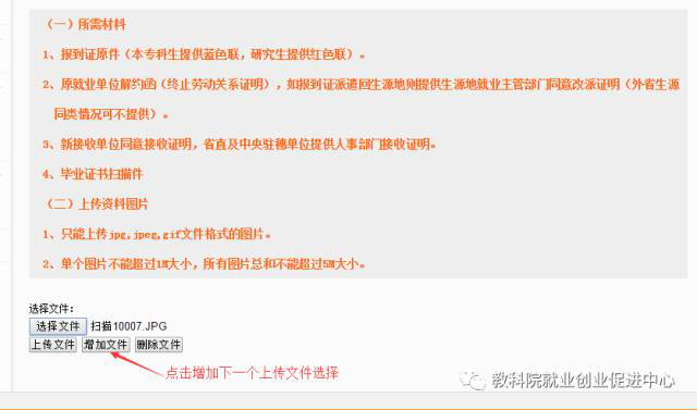 4、上传改派所需材料。点击“选择文件”后选择要上传的文件,点击“增加文件”后可以上传下一个文件,选择完所有要上传的文件后,点击“上传文件”。