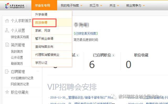2、选择改派申请。登录账号后,点击“毕业生专用”-“改派申请”。