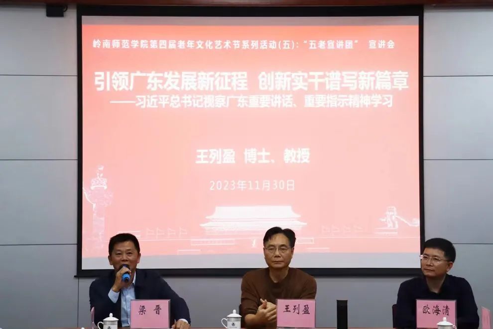 11月30日下午,学校“五老宣讲团”团长、教育科学学院前党委书记王列盈应邀在教育科学学院院会议室以“引领广东发展新征程,创新实干谱写新篇章”为主题,举办习近平总书记视察广东重要讲话、重要指示精神学习宣讲会。学校离退休人员服务中心党委书记、主任、关工委秘书长欧海清、教育科学学院党委书记梁晋、党委副书记陈理才、学校关工委办公室主任杨梅、教科院辅导员李水清老师、黄谭腾老师共同出席了本次会议。