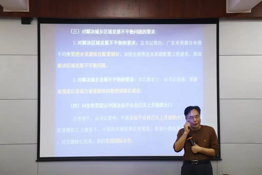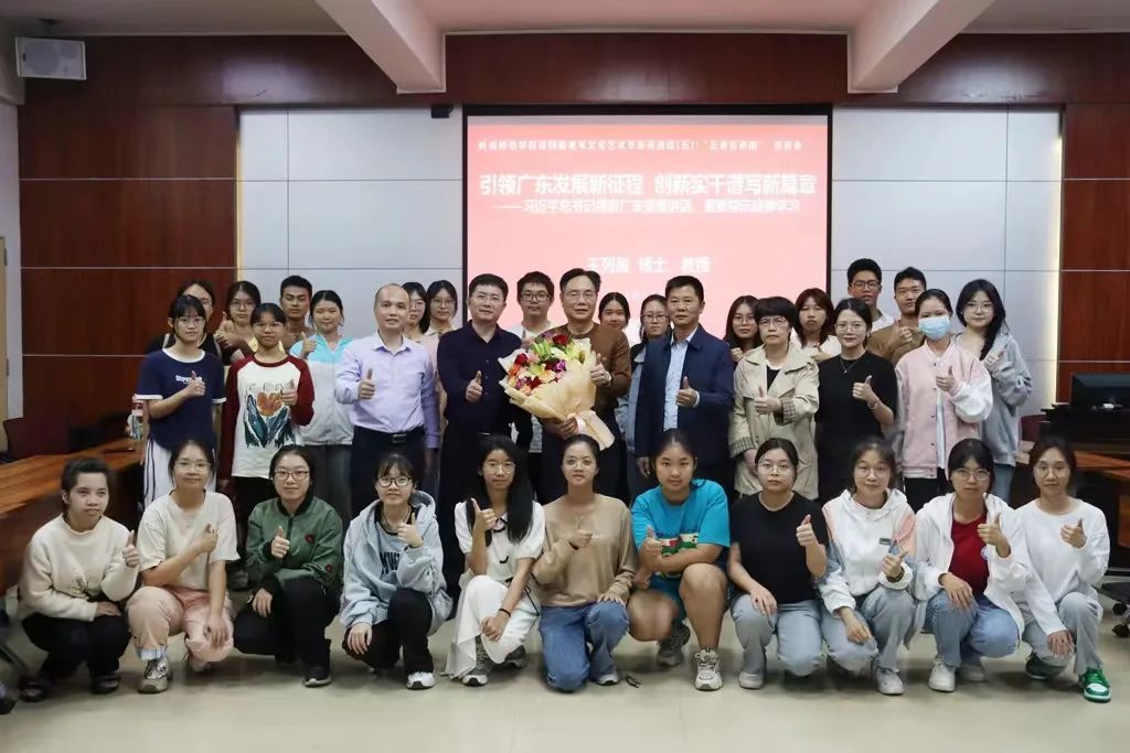 王列盈从习近平总书记视察广东的基本情况、习近平总书记视察广东发表的重要讲话、重要指示精神和广东如何贯彻落实三个方面,从纵横角度,深入浅出地阐述了广东如何实现高质量发展,引领广东发展新征程,谱写广东高质量发展的新篇章。王列盈强调,走好广东高质量发展之路,要在习近平总书记的重要指示下找准定位,一是要大力建设粤港澳大湾区,将对大湾区的定位抓紧、做实,集聚全省的力量集中建设大湾区。二是全面构建经济发展新格局,以制造业为主,发展新型农业经济,努力贯彻五大发展理念,使广东担当好“排头兵、先行地、实验区”的责任。三是创新实干谱写新篇章,“创新”和“人才”在广东未来发展中应处于重中之重的位置,培养新型创新人才,落实广东高质量发展的举措刻不容缓。最后王列盈勉励同学们要坚定理想信念,增强自身本领,主动融入国家发展,为实现中华民族伟大复兴贡献力量。