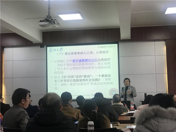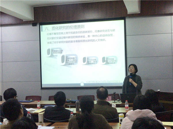 开班典礼结束后,为期三天的研修课程分别由我校教育科学学院郑剑虹教授、北京师范大学刘力教授、南京师范大学杨莉萍教授、苏州大学吴继霞教授担任主讲人。郑剑虹教授首先作了“心理学质性研究进展、价值与意义”的专题讲授,随后,杨莉萍教授讲授“心理学质性研究的方法论基础”,第二天由刘力教授和杨莉萍教授分别主讲“扎根理论”和“质性研究论文写作”;最后一天由郑剑虹教授和吴继霞教授共同主讲“生命叙事与心理传记学”。