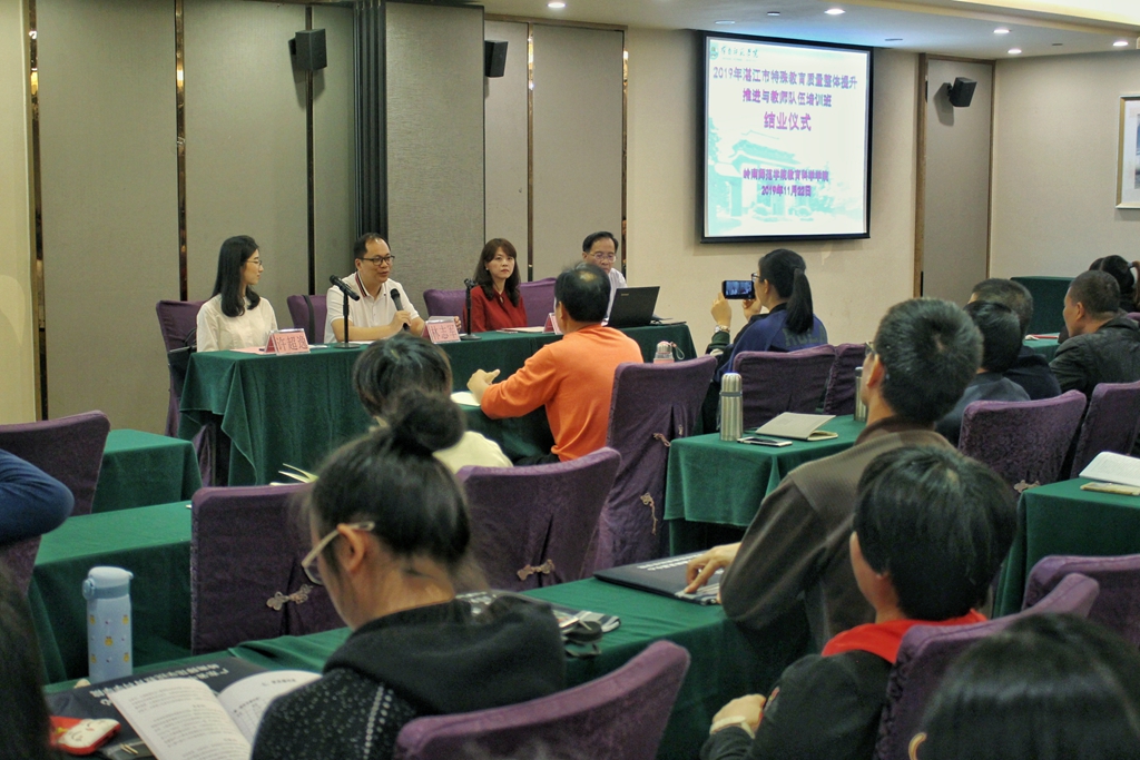 11月22日上午,教科院于湛江市环球国际酒店二楼会议厅举行2019年湛江市特殊教育学校教师业务能力提升培训结业仪式。教科院党委副书记林志军、项目负责人杨溢、许超逸老师和全体学员出席了本次结业仪式。
