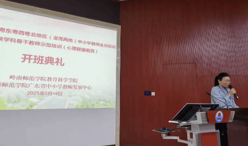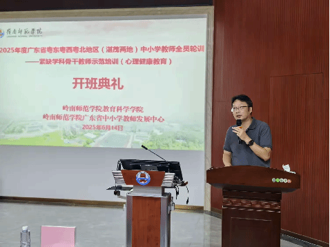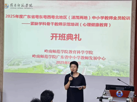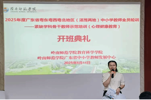 为贯彻落实广东省教师队伍建设规划,加强湛江、茂名两地心理健康教育师资力量,提升紧缺学科骨干教师的专业能力,由岭南师范学院广东省中小学教师发展中心、岭南师范学院教育科学学院承办的湛茂两地中小学教师全员轮训——紧缺学科骨干教师示范培训(心理健康教育)在6月14日正式开班。来自湛江、茂名两地的中小学心理健康教育骨干教师齐聚一堂,共同开启本次专业赋能之旅。开班典礼由培训班班主任郑燕东主持。典礼现场气氛庄重而热烈,学员们精神饱满,充满对学习的期待。