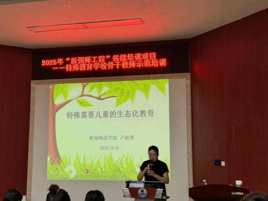 2025年6月9日,“新强师工程”省级特殊教育学校骨干教师示范培训班在湛江圆满结业。来自全省的特殊教育骨干教师齐聚一堂,围绕“特殊需要儿童生态化教学”主题展开深度研修,共同探索特殊教育回归生活本质的创新路径。
