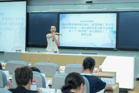 吴川市浅水镇中心幼儿园园长王华荣作为学员代表发言,她代表全体学员,向组织本次培训的领导与教授致以最诚挚的谢意,让大家拥有这个沉淀自我、交流学习的宝贵平台。结合自身工作经验,分享了幼儿园园长的工作,承载着守护孩子成长、引领园所发展的重任。此次培训既是“充电赋能”的契机,更是校准方向、突破瓶颈的关键,最终达成学以致用。同时,将此次培训的收获与精神传递给身边的同事,带动更多幼教工作者共同进步,为“三所学校”幼儿园的发展注入新活力。