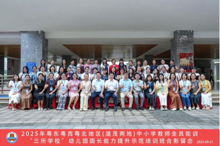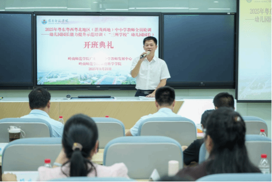 2025年9月21日,2025年粤东粤西粤北地区(湛茂两地)中小学教师全员轮训-幼儿园园长能力提升示范培训(“三所学校”幼儿园园长)开班典礼在岭南师范学院举行。岭南师范学院教育科学学院党委书记梁晋、教育科学学院副院长陈金圣等相关人员及51名幼儿园园长出席。