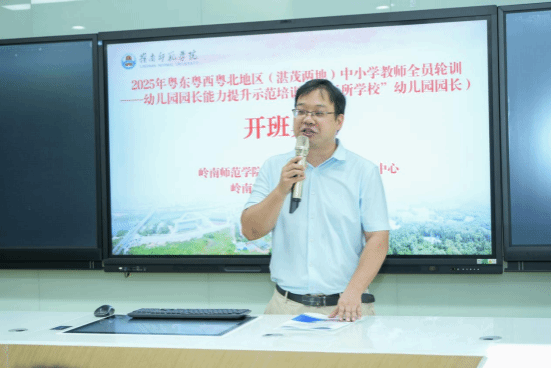 岭南师范学院教育科学学院党委书记梁晋在开班典礼上致辞,对学员表示欢迎,传达了省教育厅对培训的重视,在广东省教育强省政策背景下,岭南师范学院响应百千万工程,承担粤西地区三所学校的帮扶任务,包括湛江、茂名等地的中小学及幼儿园。学院提议并成功实施了针对三所学校教师、校长和园长的培训项目,旨在提升教育条件和师资能力。作为教育学科的龙头,岭南师范学院教育科学学院凭借丰富的培训经验和良好的社会反响,被委托执行此次培训,进一步推动了教育强省目标的实现。此次2025年粤东粤西粤北地区(湛茂两地)中小学教师全员轮训——幼儿园园长能力提升示范培训(“三所学校”幼儿园园长)是高校纵向帮扶“三所学校”任务中的一项重要支持措施,旨在提高园长们的专业素养和管理能力,以更好地服务基层学前教育。并介绍了岭南师范学院百年师范教育历史与成就,教育科学学院涵盖小学教育、学前教育、心理学等多个专业,公费师范生录取分数高,社会影响力显著。同时提出三点期望,提高政治站位、强化责任担当,共建安全培训环境。特别呼吁学员要注意防疫和蚊虫叮咬,以顺利达成培训目标,为后续共建工作打下坚实基础。