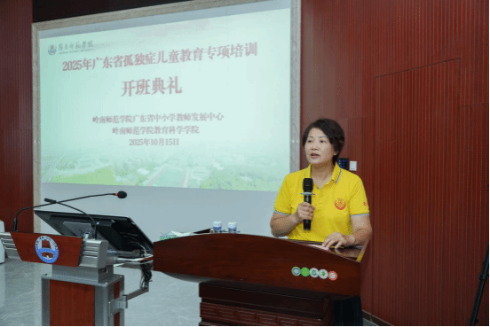 郑赞芳在讲话中首先对全体参训教师的到来表示热烈欢迎,回顾了岭南师范学院在特殊教育领域的办学积淀与成果,她强调,随着孤独症儿童教育需求的不断增长,提升教师专业能力迫在眉睫,希望参训教师珍惜本次学习机会,将理论知识与教学实践深度融合,未来能以更科学的方法、更温暖的态度守护孤独症儿童成长,为广东省特殊教育事业发展注入新动能。