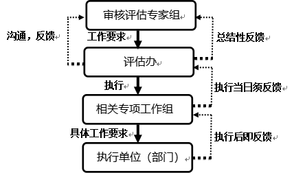 专家组向学校提出工作要求后,由评估办进行分析分解,向各专项工作组发布,各执行单位(部门)执行并反馈给专项工作组,专项工作组汇总后于执行当日反馈给评估办。