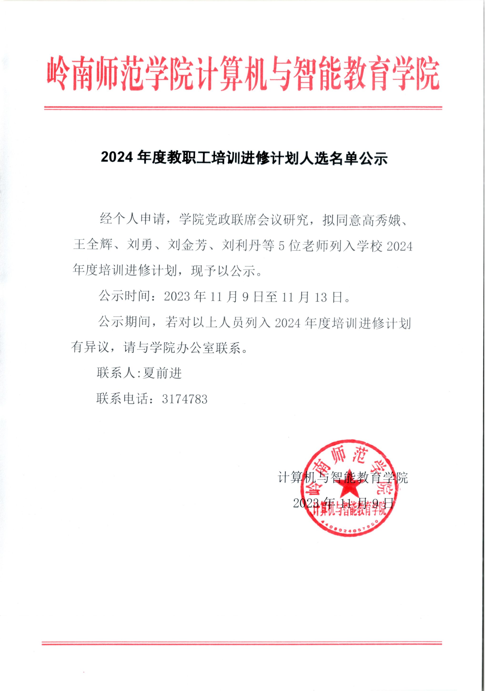2024 年度教职工培训进修计划人选名单公示
