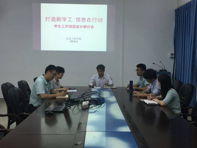 为贯彻落实学校2018年度学生工作会议精神,围绕“立德树人”的根本任务,对标新时代,打造新学工,近日,信息工程学院在雷阳楼b栋101室召开“打造新学工,信息在行动”之学生工作顶层设计研讨会。学院党委吴万副书记以及辅导员彭东丽、屈志奋、刘利丹、潘堪达和张茜等老师出席了会议。