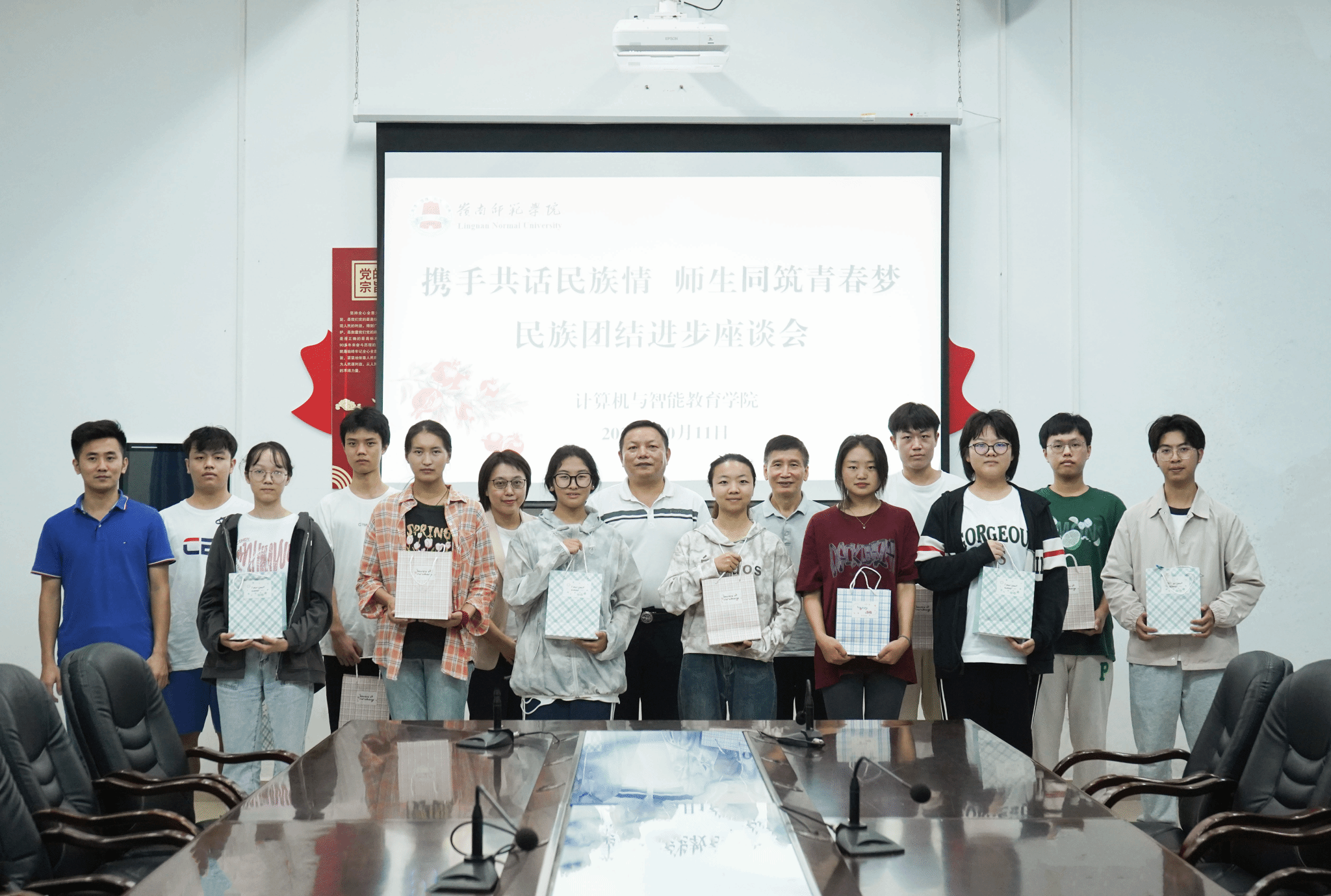 会后,全体参会人员合影留念。本次座谈会充分体现了计算机与智能教育学院对少数民族同学的关心,在关注和推进少数民族学生相关工作的同时也增进了少数民族学生与老师、同学之间的沟通,促进了各民族同学的文化认同与文化交流。我们期待各民族同学团结一致,携手同行,共筑青春梦。