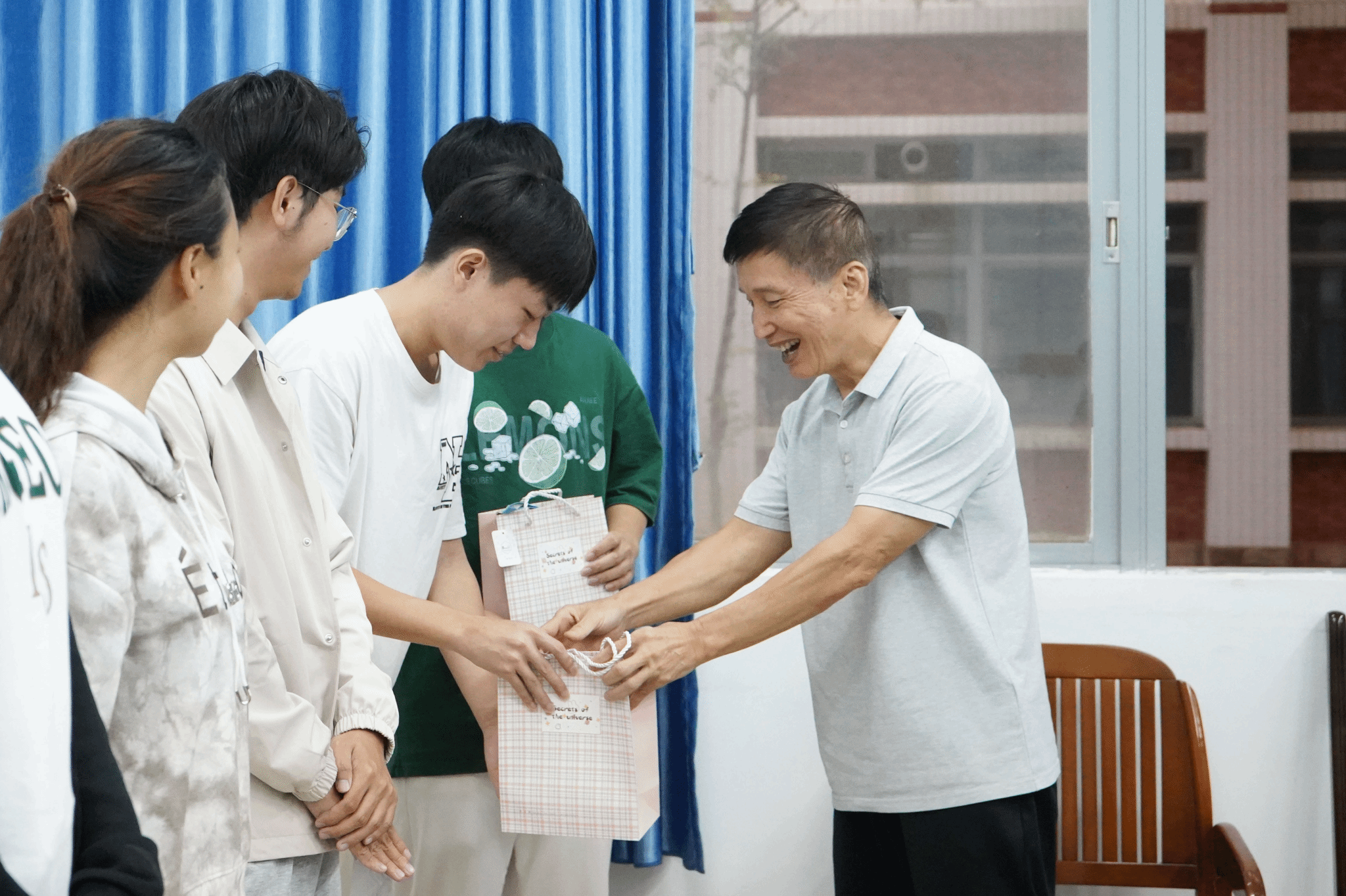 会议结尾,由学院关工委副主任、原信息工程学院副院长邓明为全体少数民族学生送上纪念品。