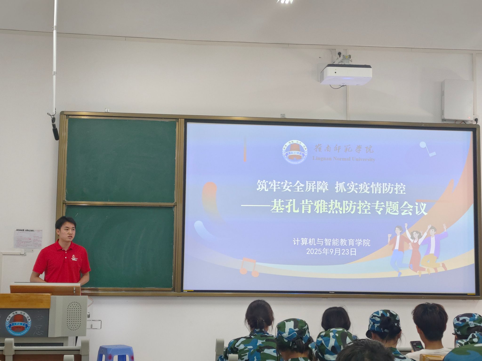 紧接着,邓海波老师针对近期需重点防范的基孔肯雅热疫情开展专题培训。他介绍,基孔肯雅热是由蚊虫叮咬传播的急性传染病,主要症状为发热、关节剧痛、皮疹等,目前暂无特效疫苗,预防关键在于防蚊灭蚊。他要求学生做好个人防护,外出时穿戴长袖衣物、涂抹驱蚊剂,避免在蚊虫活跃时段长时间停留户外若出现发热、关节疼痛等不适症状,需第一时间向辅导员报备,由辅导员引导就医,坚决杜绝瞒报、漏报情况。