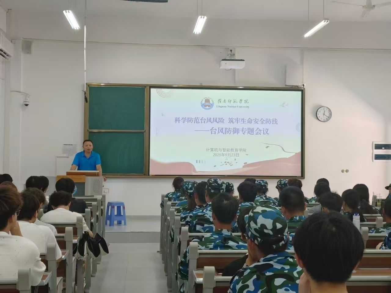 学院党委书记李海文发表专题讲话,围绕 “科学防范台风风险,筑牢生命安全防线” 主题,结合湛江地区台风多发的地理气候特点,对台风防范工作提出明确要求。他强调,安全是一切工作的前提和基础,全体学生必须提高政治站位,充分认识台风防范的重要性和紧迫性。李书记从 “预警响应、提前准备、应急处置” 三个环节作出部署:一是密切关注气象部门发布的台风预警信息,严格遵守学校发布的应急管理通知,不存侥幸心理;二是提前做好防范准备,及时加固宿舍门窗,收纳阳台、窗外的花盆、衣物等易坠物品,储备必要的饮用水、食物和常用药品;三是台风期间严禁外出,远离大树、广告牌、老旧建筑等危险区域,避免前往沿海、低洼地带,若遇险情需保持冷静,按照学校应急预案有序避险,并第一时间联系辅导员或学校应急部门。他特别叮嘱 2025 级新生,初到湛江需尽快适应本地气候特点,主动学习防灾避险知识,提高自我保护能力。
