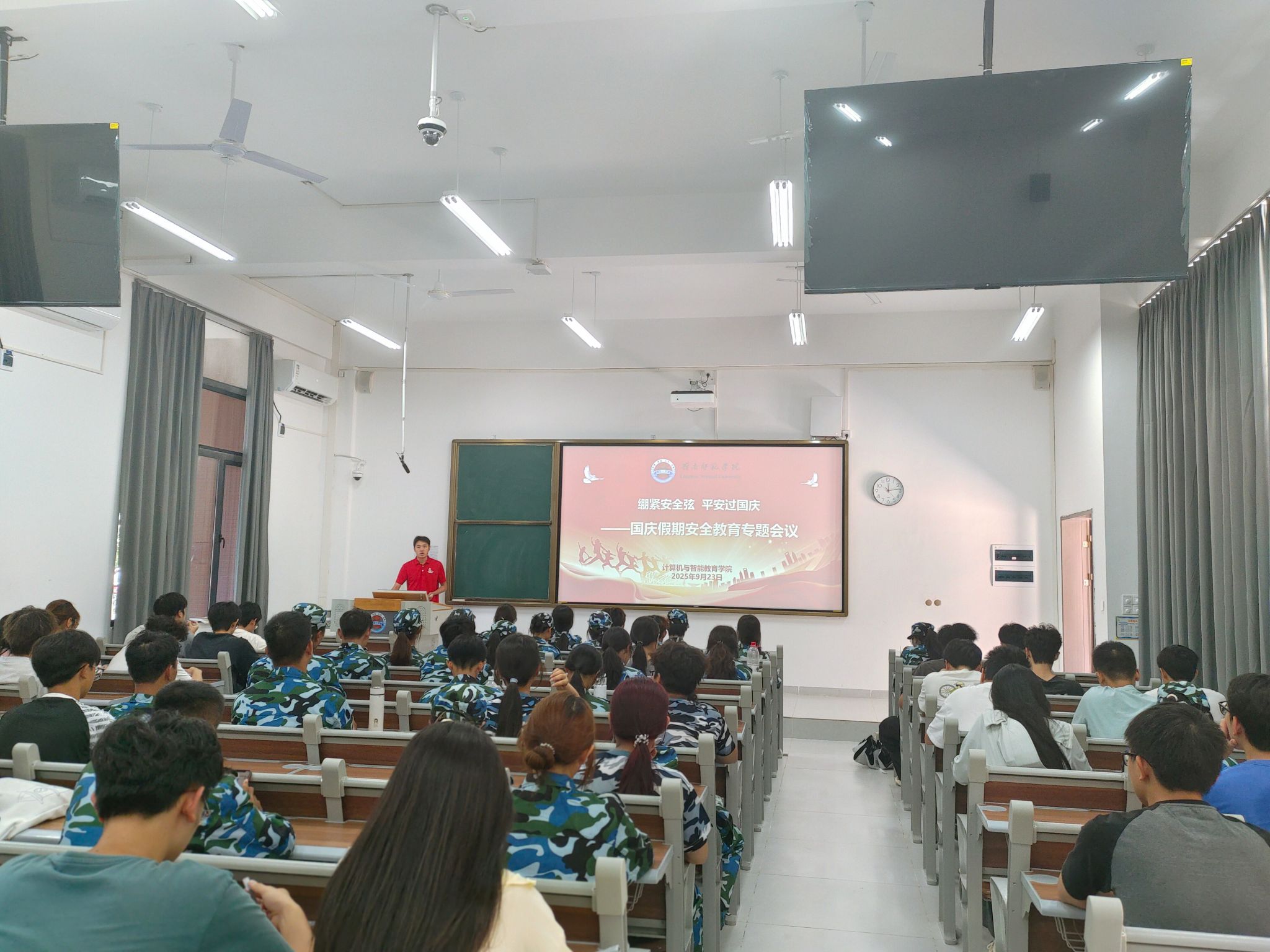 邓海波老师以 “绷紧安全弦,平安过国庆” 为核心主题,结合假期安全高发风险点展开专项教育。他从出行安全、消防安全、财产安全、网络安全及遵纪守法等方面进行细致讲解提醒学生国庆期间务必加强安全防范。