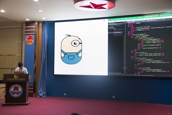 会上,八大社团上演了各具特色的精彩节目。其中,计算机开发研究协会带来“现场网页设计”表演,表演者双手在键盘哒哒声地快速敲过一行行代码,使屏幕中的黄蓝色图样慢慢变成了生动的“小黄人”。在走秀节目中,电子爱好者协会展示了他们精致的电子产品。独特的“单膝下跪,手拿螺丝刀”的“理工式”求婚,更是赢得了现场观众的阵阵掌声。