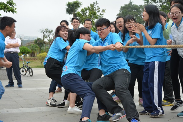 此次的素质拓展共分为三个游戏环节,将各机构的成员随机的分为四个小组,通过小组间游戏的比拼去加强彼此交流合作的意识。第一个游戏名为“传递欢乐”,是一个用呼啦圈接龙的团队合作型游戏。在呼啦圈接龙中,每个小组的成员都施展浑身解数,想要使呼啦圈移动速度达到最快,为自己的小组争取胜利。第二个游戏则是“丑小鸭赛跑”,需要小组的成员们用膝盖夹住排球进行每人15米的接力赛跑,用时短者胜。比赛期间,小伙伴们以一个个特殊的姿势去夹住排球或是跳或是赛跑,现场欢乐满满。到了最后的一个活动游戏——“终极战斗”拔河比赛的时候,全场的气氛被彻底点燃!拔河比赛以队员所在机构为单位,以三局两胜的赛制决胜出名次。从安排队伍到实战阶段,每个人都精神饱满的投入其中。在拔河的时候,上场的小伙伴都使出了浑身的力气,忽略了所有的劳累与疼痛,誓要为自己机构的荣誉而战!一旁观战的成员也拼尽全力的为己方队友呐喊加油。在一片欢呼声和掌声中,宣委会最终夺得拔河比赛的桂冠。