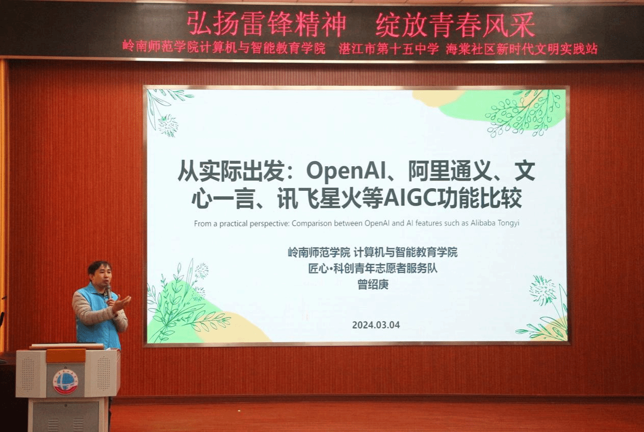 为深入学习贯彻党的二十大精神及习近平总书记对深入开展学雷锋活动作出的重要指示精神,大力弘扬“奉献、友爱、互助、进步”的志愿服务精神,进一步推动大学生社区实践服务,3月4日,岭南师范学院计算机与智能教育学院“匠心科创”青年志愿者服务队与湛江市第十五中学以及赤坎海棠社区举办一系列以“弘扬雷锋精神 绽放青春风采”为主题的志愿活动。