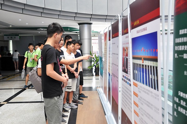 同学们一行认真参观展览的各项展板,深入了解“反间防谍”的相关内容。同学们或指着展板各抒己见相互探讨,或安静地观看皱眉凝思,或看完意犹未尽,用手机搜索再次了解。