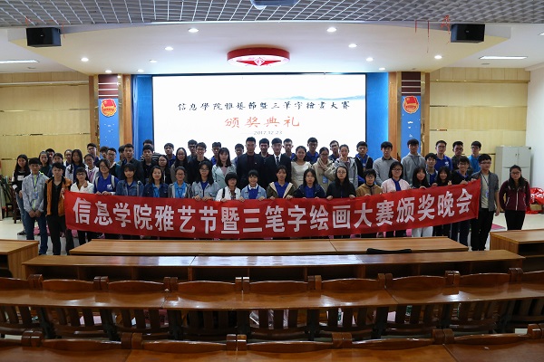 12月23日,信息工程学院雅艺节暨三笔字绘画大赛颁奖典礼于弘雷楼311成功举办。宣委指导老师屈志奋,17级辅导员张茜,以及各二级学院学生干部代表出席此次活动。
