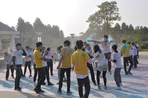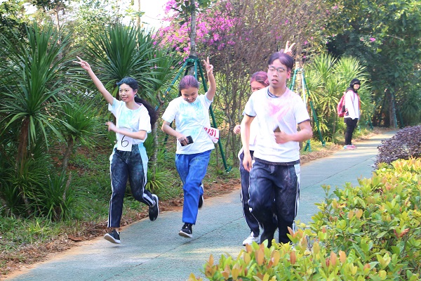 最让同学们为之兴奋的要属快乐彩跑环节。一波又一波五彩缤纷的精灵在跑道上卖力奔跑着,他们以持之以恒的耐力坚持跑完两公里的路程,灿烂美丽的笑容在阳光下熠熠生辉。路过撒粉点时,一队员冲在前头掩护,护送其他队员奋力躲过撒粉障碍,以求在更短的时间内跑完全程。别样多彩撒粉项目引得路人纷纷驻足观望,过路的大人小孩也都玩闹着说也想要撒粉。同学们飞扬自信的脸庞,笑逐颜开路人,恍若一幅青春动人的美景图。