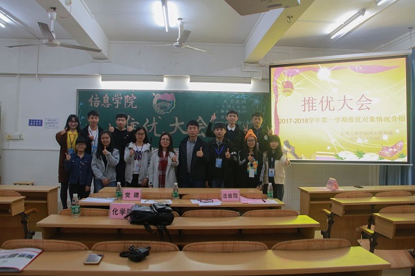 为引导广大优秀团员青年积极向党组织靠拢,向党组织输送新鲜血液,促进学院党建工作持续发展,11月26日,信息工程学院于燕雷楼502室举办2017—2018学年第一学期推优大会。团委指导老师刘利丹,校团委组织部韦盈盈、叶铭、学院团委副秘书长王泽苇以及各二级学院干部出席本次推优大会。