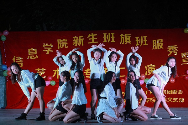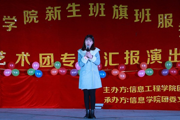 11月25日晚,信息工程学院于师道园开展新生班旗班服秀暨艺术团专场汇报演出活动。信息学院辅导员刘利丹、张茜老师,部分学生干部代表,17级部分班主任以及全体新生出席了此次活动。