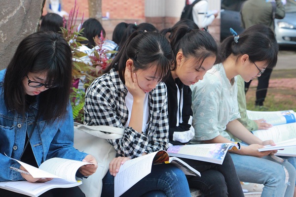 雷阳楼附近,各个班级或拾阶排列,或结队成团,或围坐在石凳上。同学们手捧着复印的资料或者综合教程课本,专注地朗读着英语。学子们充满自信的朗读声,奋发着蓬勃朝气,彰显17级年轻学子的青春活力。“早晨是最好记忆时间,晨读能够帮助我们更好地记忆单词,且能让我们精神一点。”17电信1班的一名同学说道。