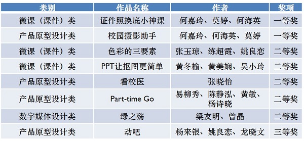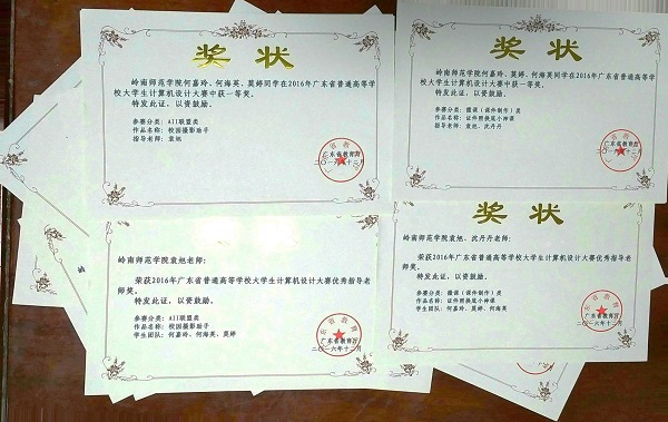 由广东省教育厅主办广州大学承办的“2016年广东省普通高等学校大学生计算机设计大赛”决赛于2016年9月24日在广州大学桂花岗校区举行。经过前期的初赛筛选以及现场决赛的项目介绍、作品演示和答辩的激烈角逐,来自岭南师范学院的7支参赛队以优异的表现取得佳绩,获一等奖2项、二等奖5项及三等奖1项。其中来自岭南师范学院信息工程学院教育技术学专业(数字媒体方向)的何嘉玲、莫婷和何海英3位同学的微课作品《证件照换底小神课》和移动app原型设计作品《校园摄影助手》凭借优秀的作品质量和良好的答辩表现,均获得了高含金量的大赛一等奖(获奖率仅为有效决赛作品数的6%)。