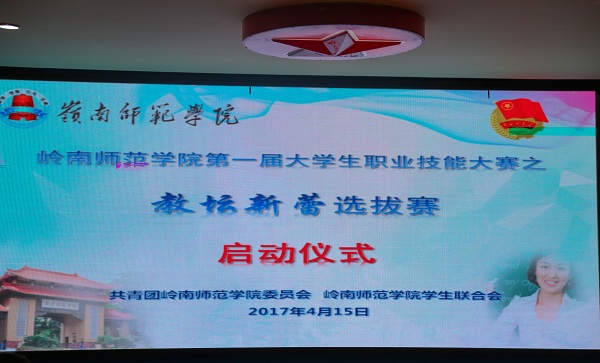 为了加强学生的教师基本技能的教学与训练,提高学生的执教能力,4月15日上午8点30,岭南师范学院第一届主题为”立师德,练师功,铸师魂”的“教坛新蕾”大赛在弘雷楼311正式启动。校团委书记李发武、校学生会主席吴婉仪,校八大学生机构主要代表以及各二级学院学生干部代表参与了本次启动仪式。