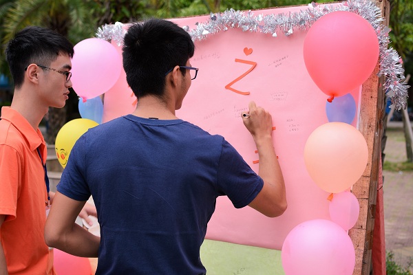 虽然这天阴云笼罩,但丝毫不影响来参加此次活动的同学的热情。活动开始不久,其中一项“飞镖扎气球”活动便受到了路过的同学们热烈追捧,在该活动区前排起了小长队。同时,也有不少经过的同学驻足留步,或在木板上写上想要分享的电影、书籍和音乐,或在桌子上拿起笔用心为朋友写下一份明信片,传达心意。