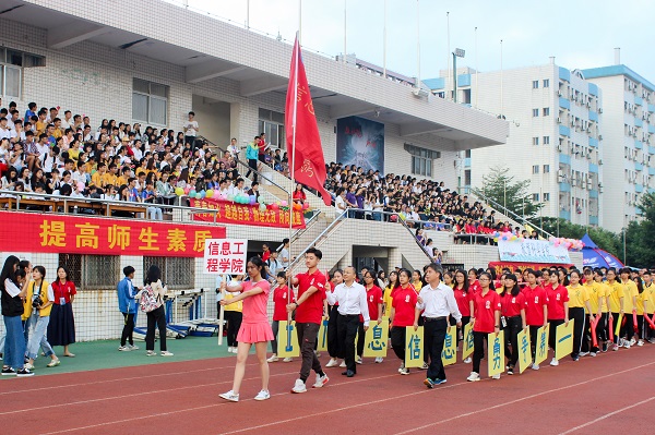 伴随着庄严的音乐,踏着整齐的步伐,。信息工程学院代表队作为第五支队伍,踏着坚定 的步伐整齐有序地走向主席台。本次信息工程学院代表队由吴万副书记和张子石副院长带队。方阵队员们面带笑容,昂首阔步,展示了信息工程学院昂扬、自信的风采,充满激情与活力的信息学子们高喊“it时代,信息最帅。信息信息,勇争第一。”学生会体育部正职负责人谭东枝表示,信息院的各个干部在两周前就已经开始准备这个方阵了,他们为这个方阵的布置制定了详细的方案,每位学生都积极配合工作,才使得此次方阵表演有序顺利地进行。